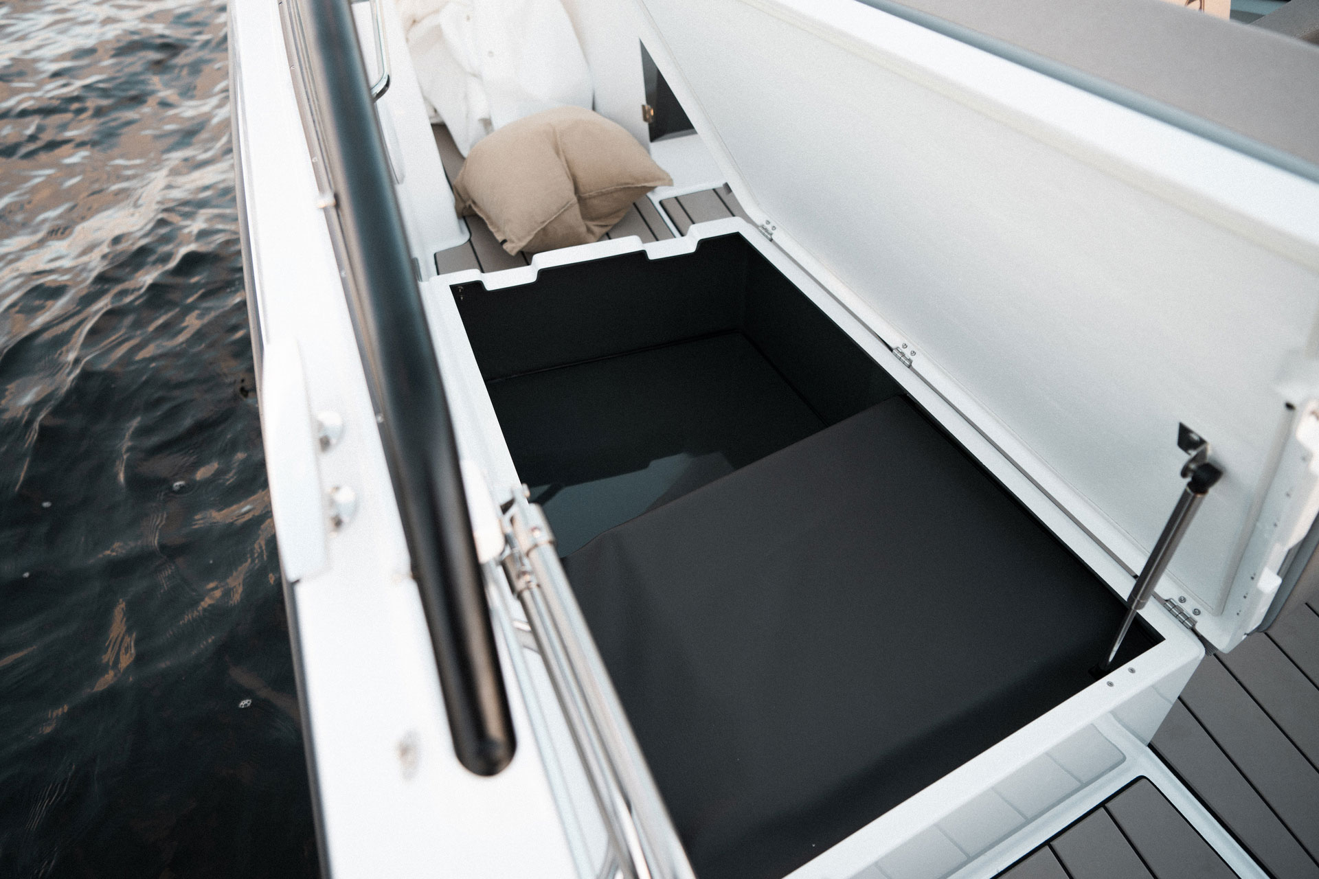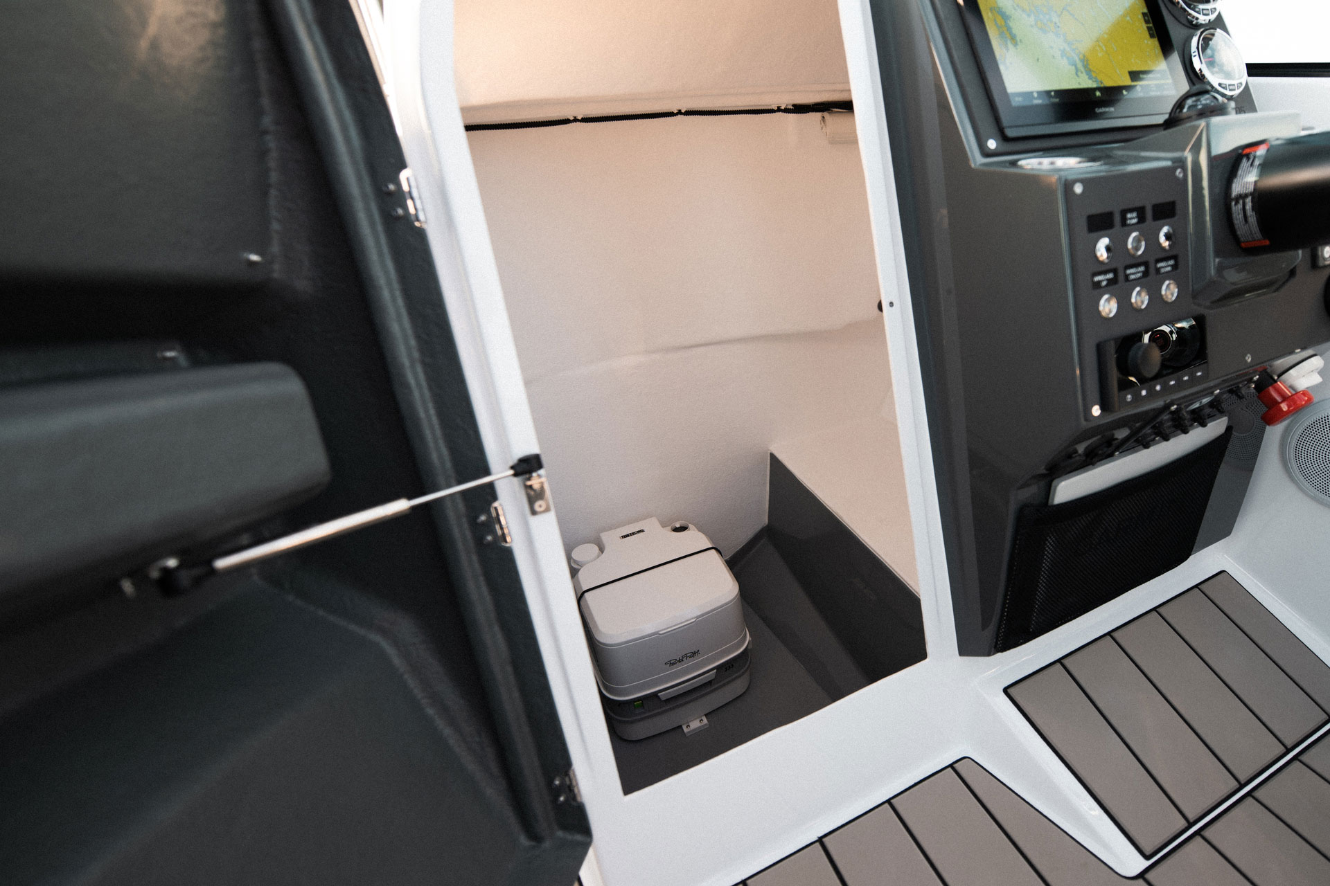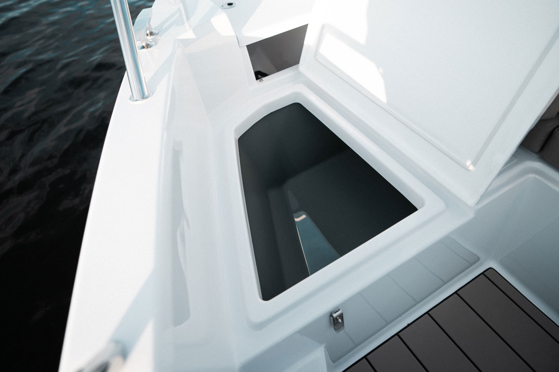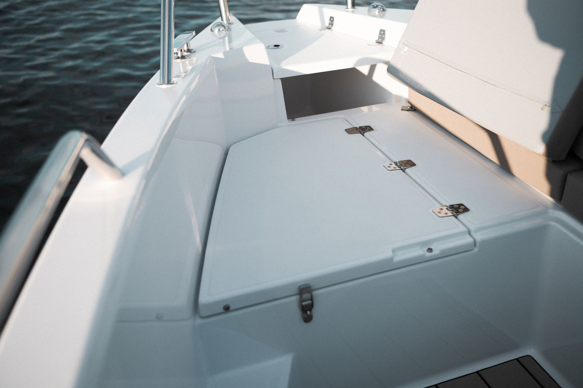 En av de mest unike løsningene i Avant 705 er den asymmetriske passasjen fra cockpit til baug på babord side. Denne løsningen gir bedre utnyttelse av plassen om bord og gjør det mulig å tilby fasiliteter som er sjeldne i en bowrider i denne størrelsen – blant annet eget toalettrom og ekstra stuerom.