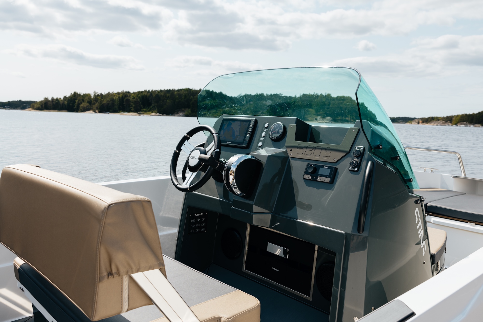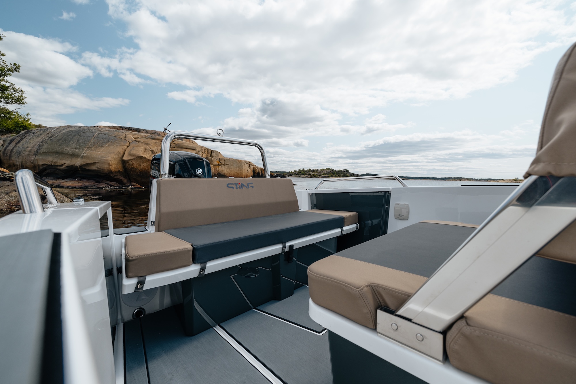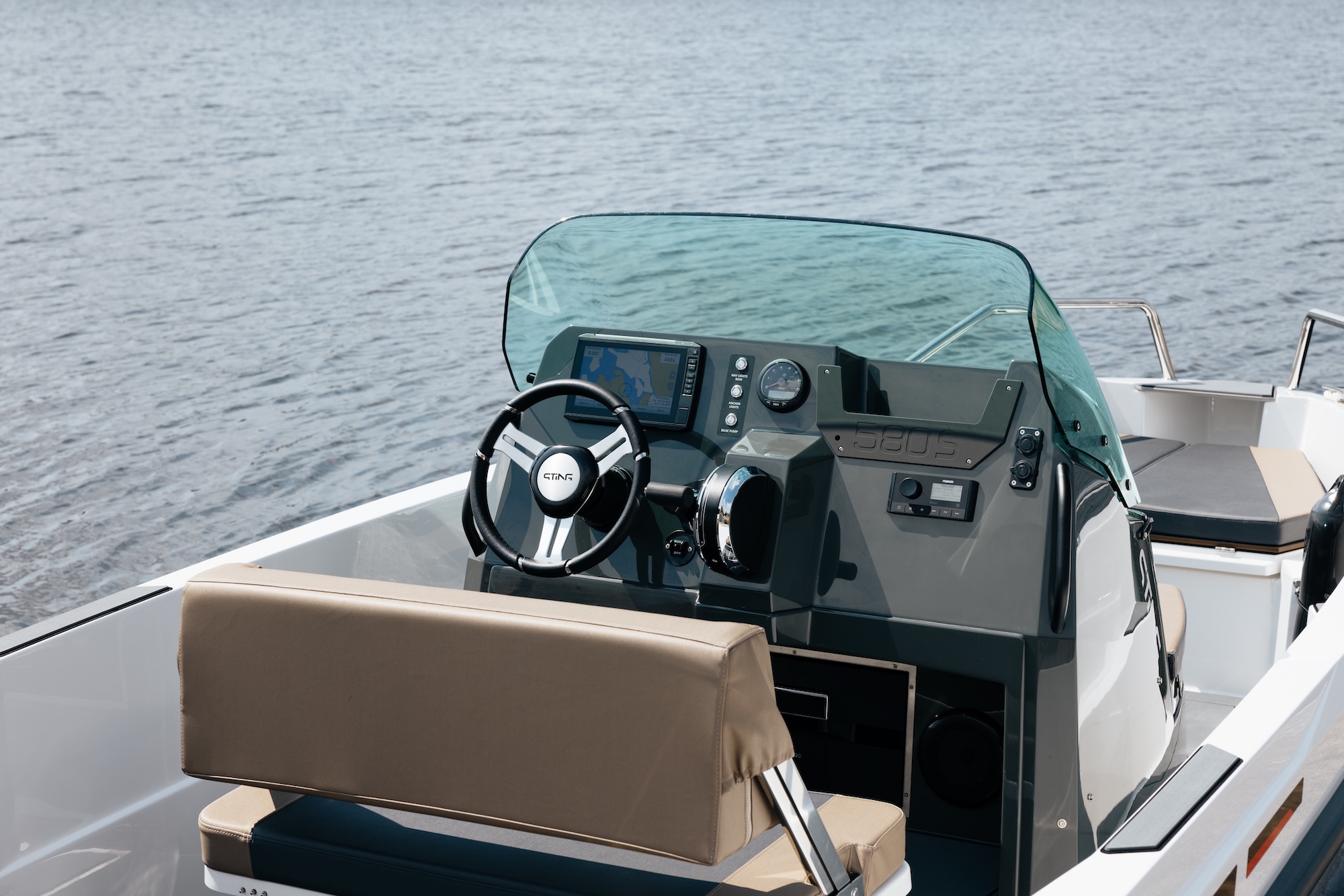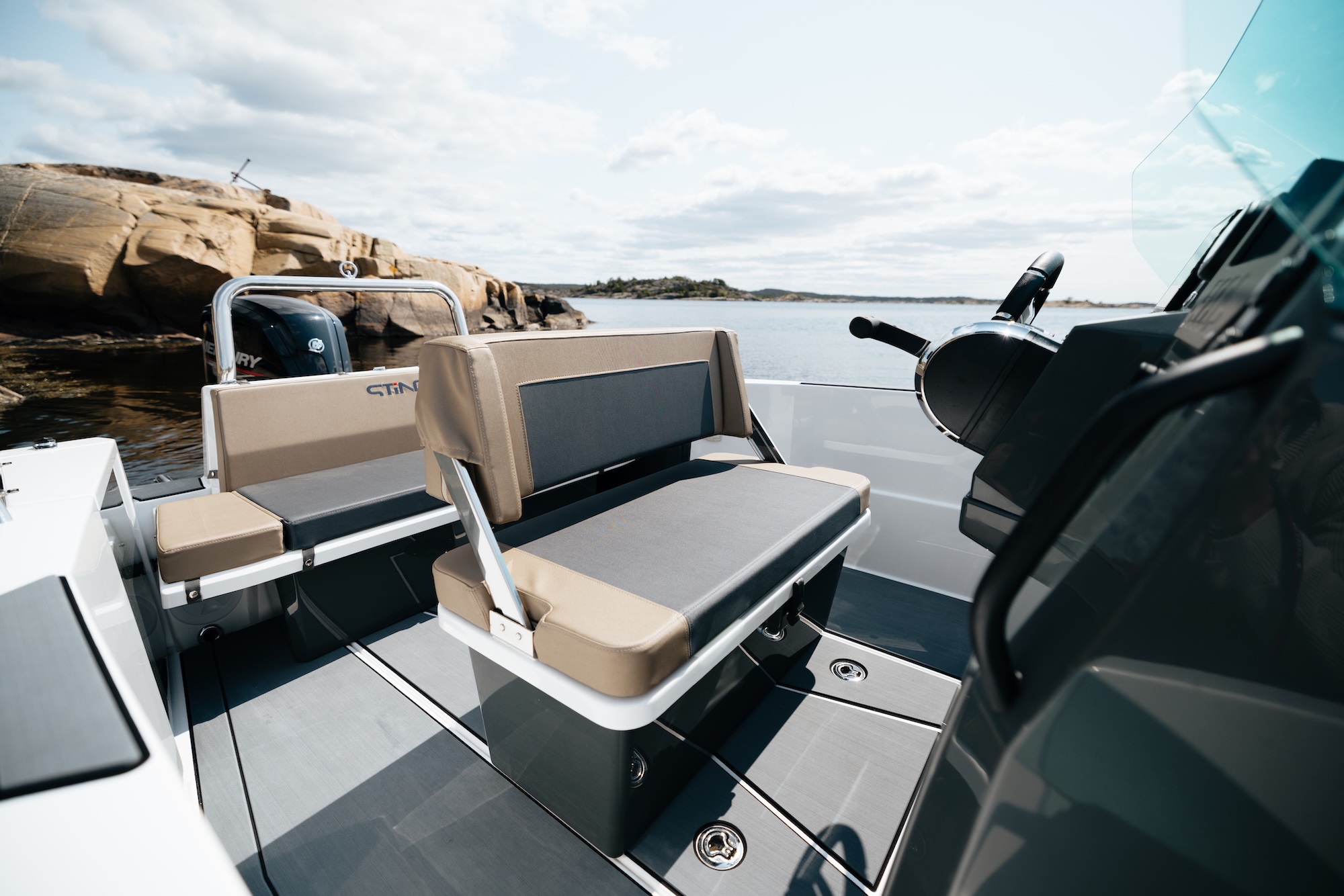 Båten er bygget på erfaringene fra Sting 485S og Sting 530S, og byr på forbedret komfort, trygghet og kjøreopplevelse. Den sentrerte førerkonsollen gir god vektfordeling og enkel passasje mellom akter og baug. Førerbenken har vendbar rygg, godt med oppbevaringsplass og praktisk trekk – perfekt for å nyte både kjøring og pause i solen.