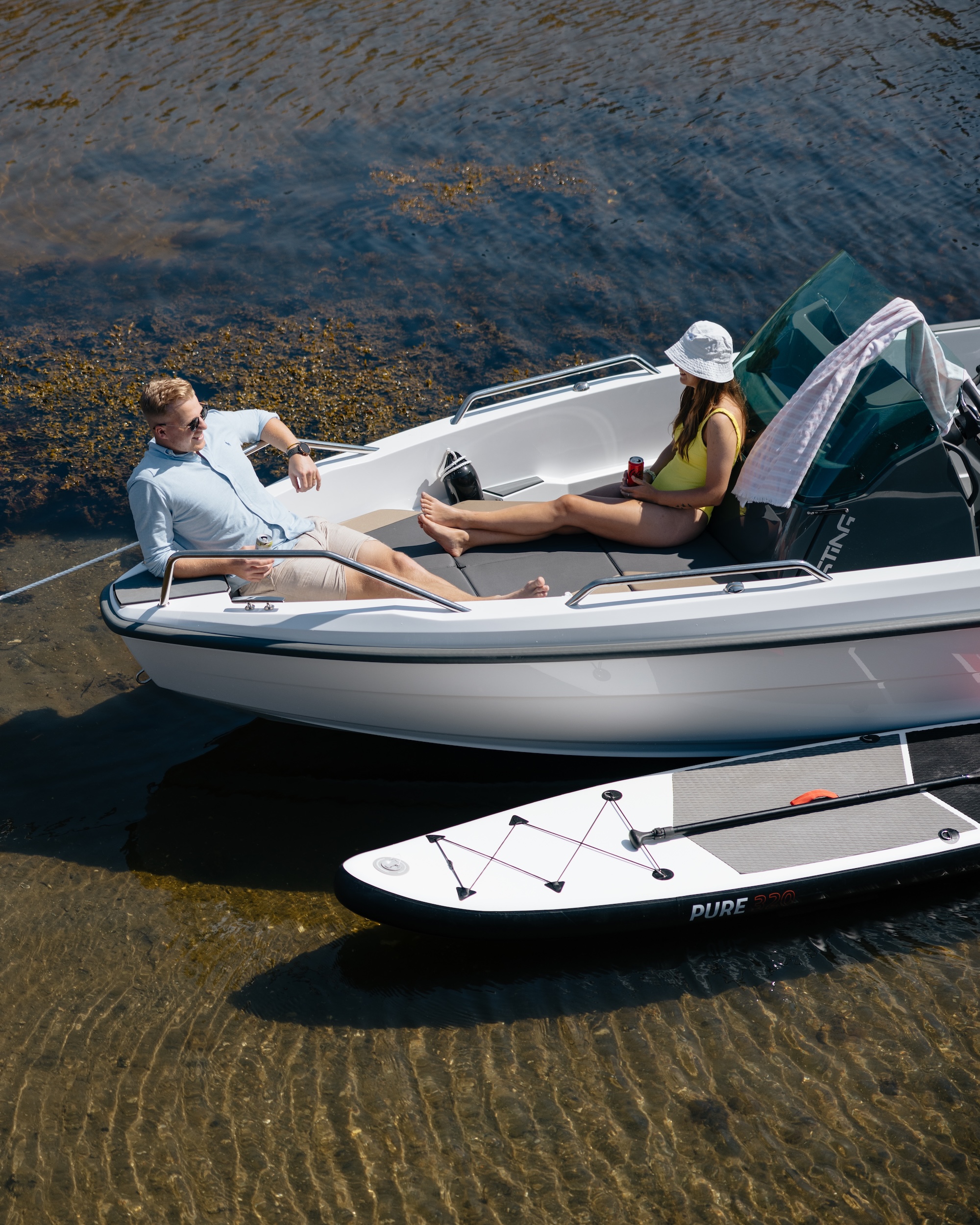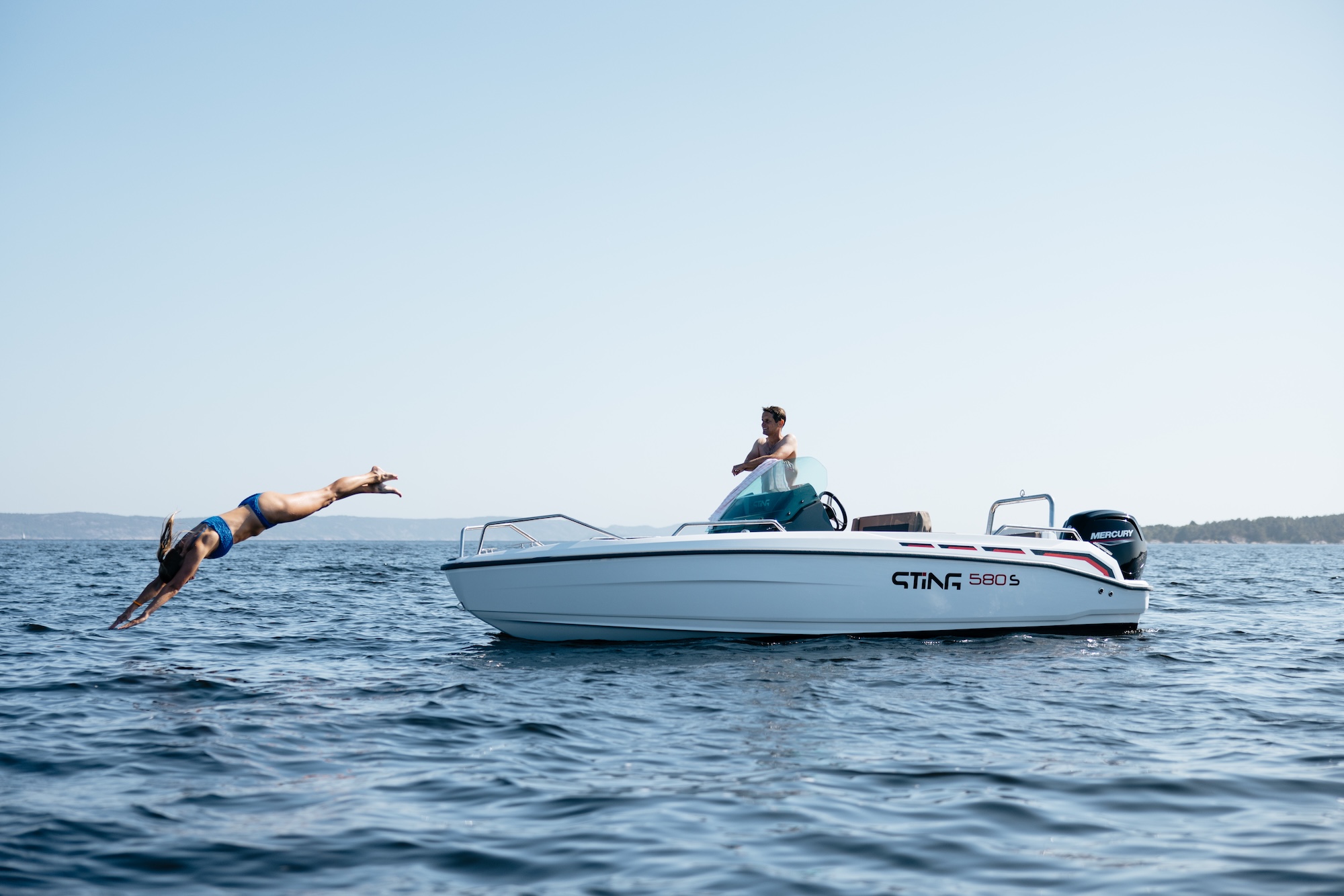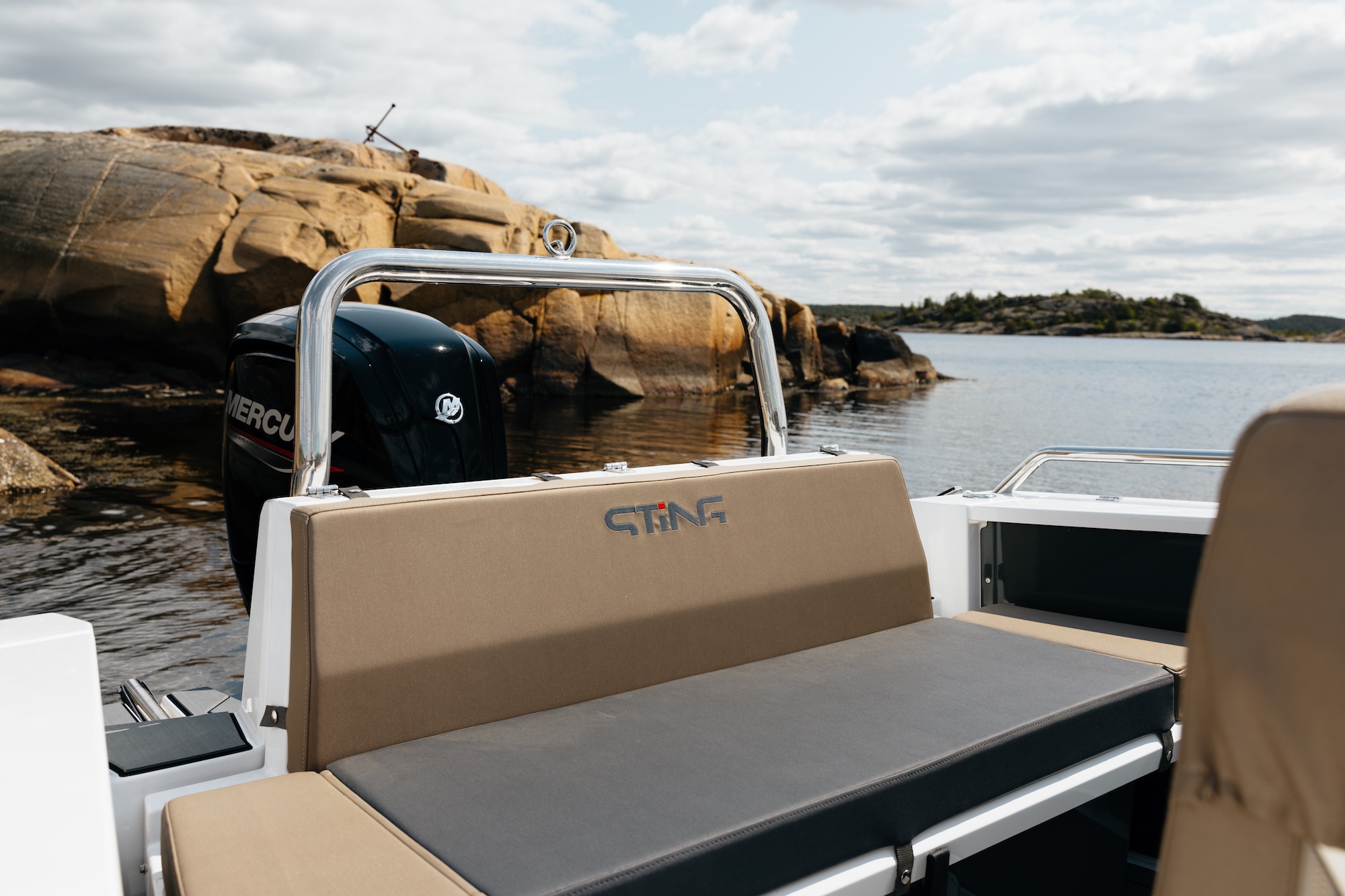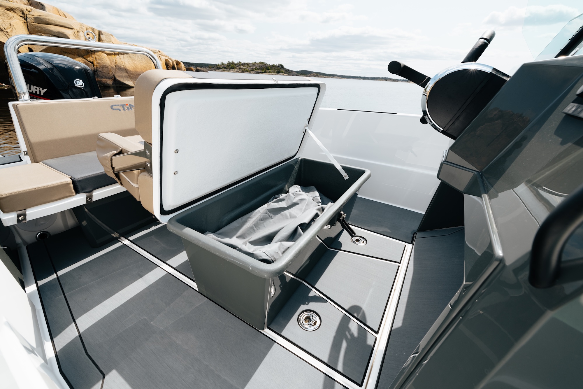 Båten er bygget på erfaringene fra Sting 485S og Sting 530S, og byr på forbedret komfort, trygghet og kjøreopplevelse. Den sentrerte førerkonsollen gir god vektfordeling og enkel passasje mellom akter og baug. Førerbenken har vendbar rygg, godt med oppbevaringsplass og praktisk trekk – perfekt for å nyte både kjøring og pause i solen.